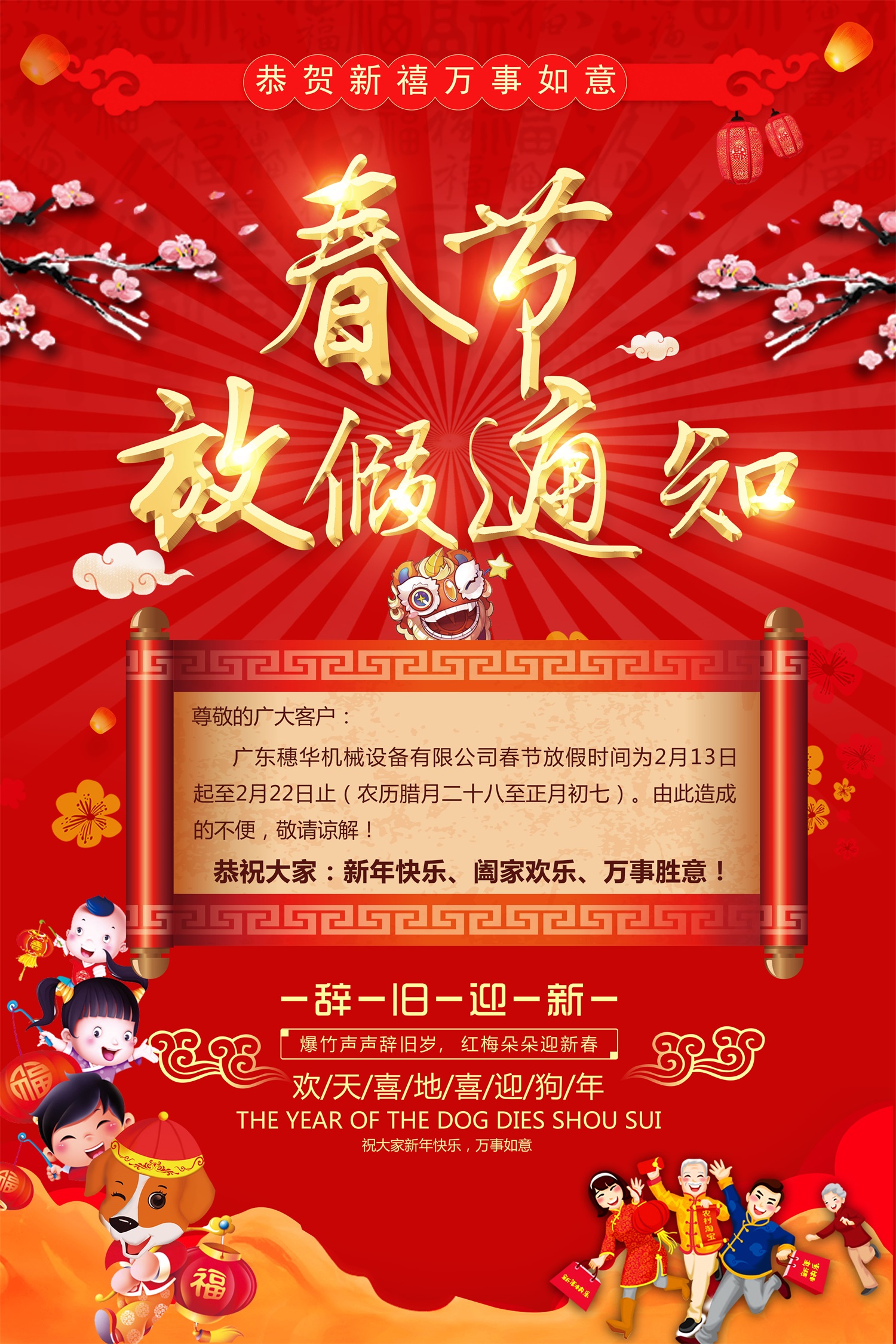 廣東穗華機械設備有限公司春節放假時間為2月13日起至2月22日止(農歷臘月二十八至正月初七)。由此造成的不便,敬請諒解!