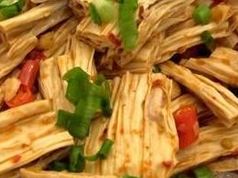 腐竹是我國傳統的大豆制品,它是將豆漿經過加熱煮沸后,挑出表面形成的一層薄膜,再經干燥或者烘干而成,可以說是豆漿中精華部分集合而成。有的地方腐竹又叫腐皮、豆腐棍、豆棍、豆筋等,人稱大豆中的“黃金”。